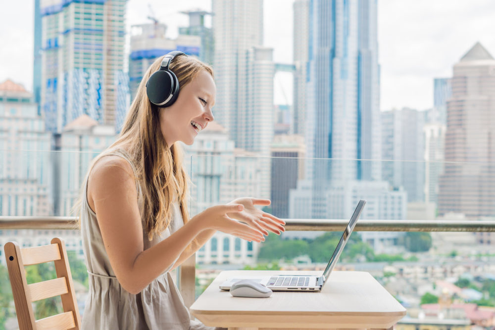 Young woman teaches a foreign language or learns a foreign language on the Internet on her balcony against the backdrop of a big city. Online language school lifestyle.
